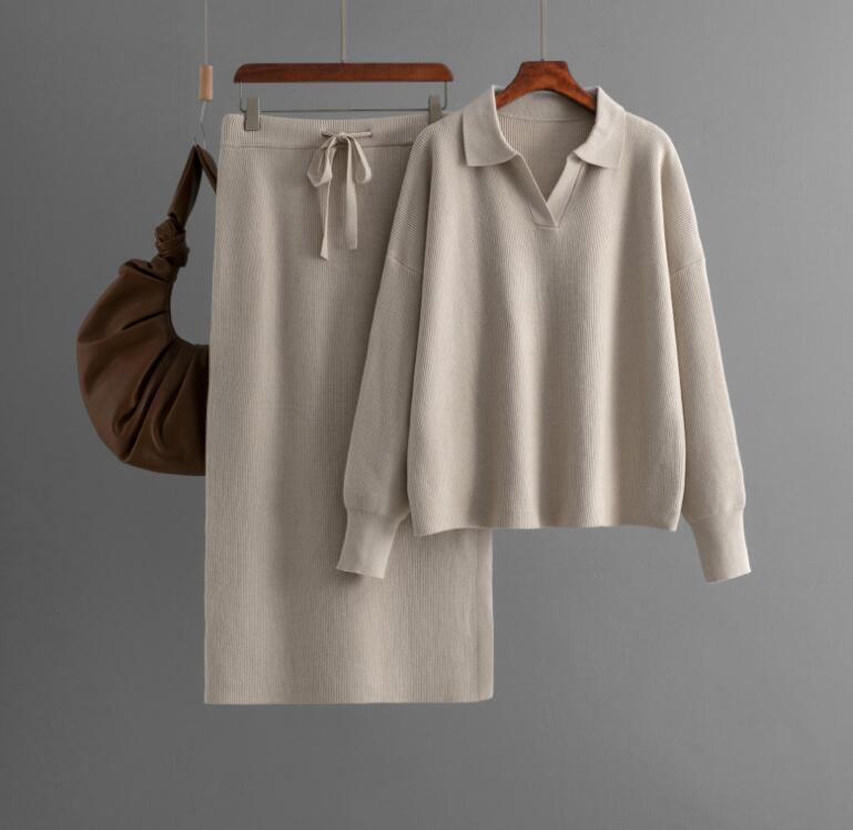 - 346 スカートスーツladiesレディース ◇ 秋冬 上質 ◇ 暖かい ニット素材 2点セット ベージュ