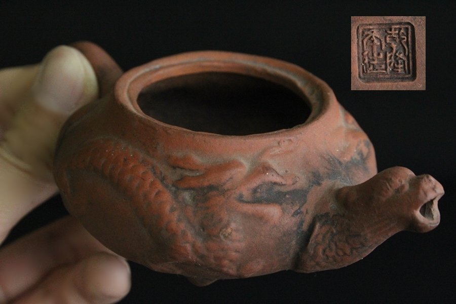 - TB526乾隆年造 中国 朱泥急須 蓋欠損◇うぶだし/在銘/獅子口/三つ脚/龍/唐物/古玩/紫砂壺/煎茶道具/時代/骨董/古美術/古道具タグボート