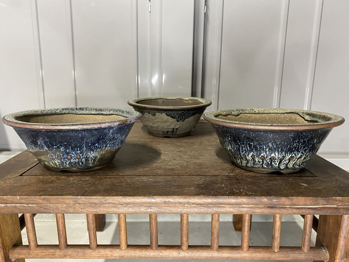 - 盆栽鉢 3点セット 青 釉 観葉植物 多肉植物 山野草 草花 花 雑木 盆栽 ミニ盆栽 小品盆栽 サボテン 鉢 植木鉢