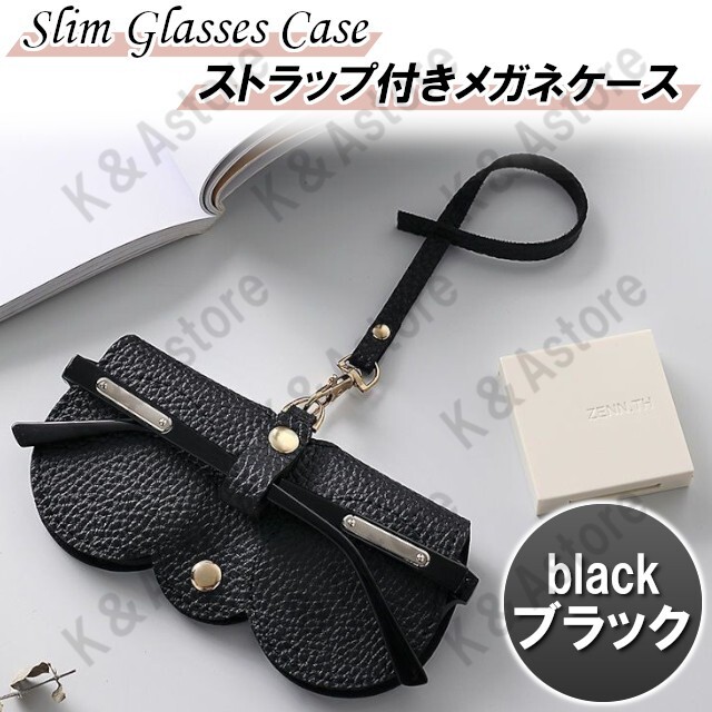 - メガネケース レザー レディース メンズ 眼鏡ケース サングラスケース 収納ケース 折りたたみ 折り畳み ストラップ付き 薄型 ブラック