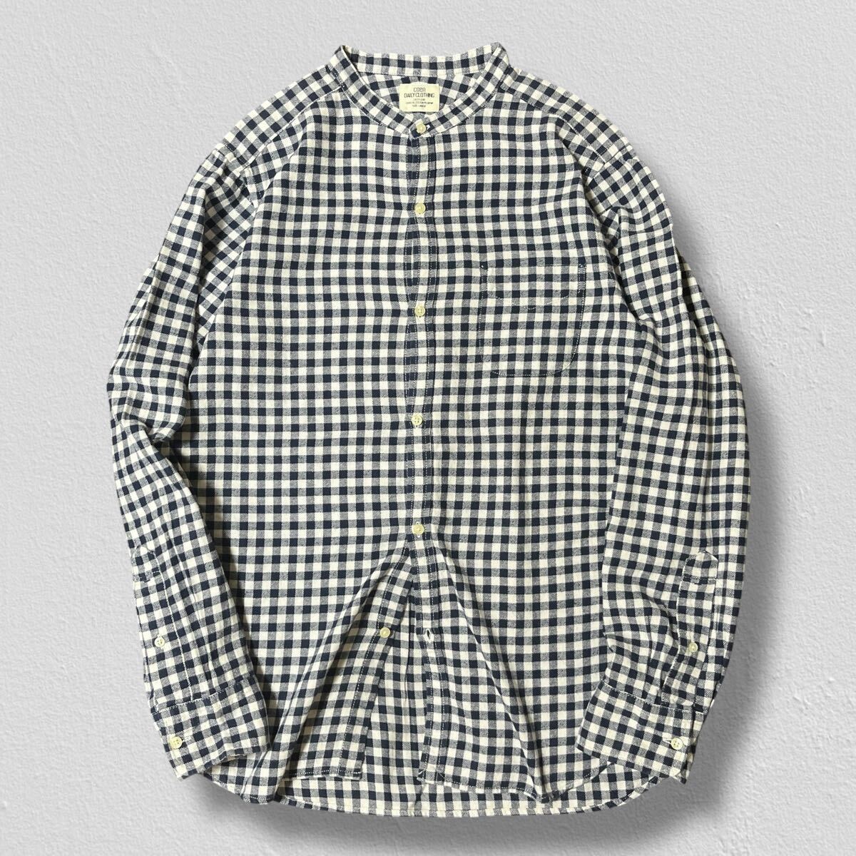 - coen 長袖ノーカラーネルシャツ ブラック×ホワイトギンガムチェック L ●洗濯プレス済●ネコポス可● コーエン シャツ 黒白 古着/631
