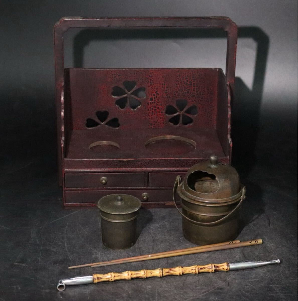 - 時代 煙草盆 ・ 竹製 煙管 ・ 銅 火箸 セット / 煎茶道具 煙管 喫煙具 銅器 茶盆 古銅 斑竹 .B1122
