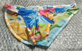 - ノーブランド製品、メンズ、ビキニ、白メッシュ地に南国風景模様色彩、ポリアミド80%、Lサイズ、