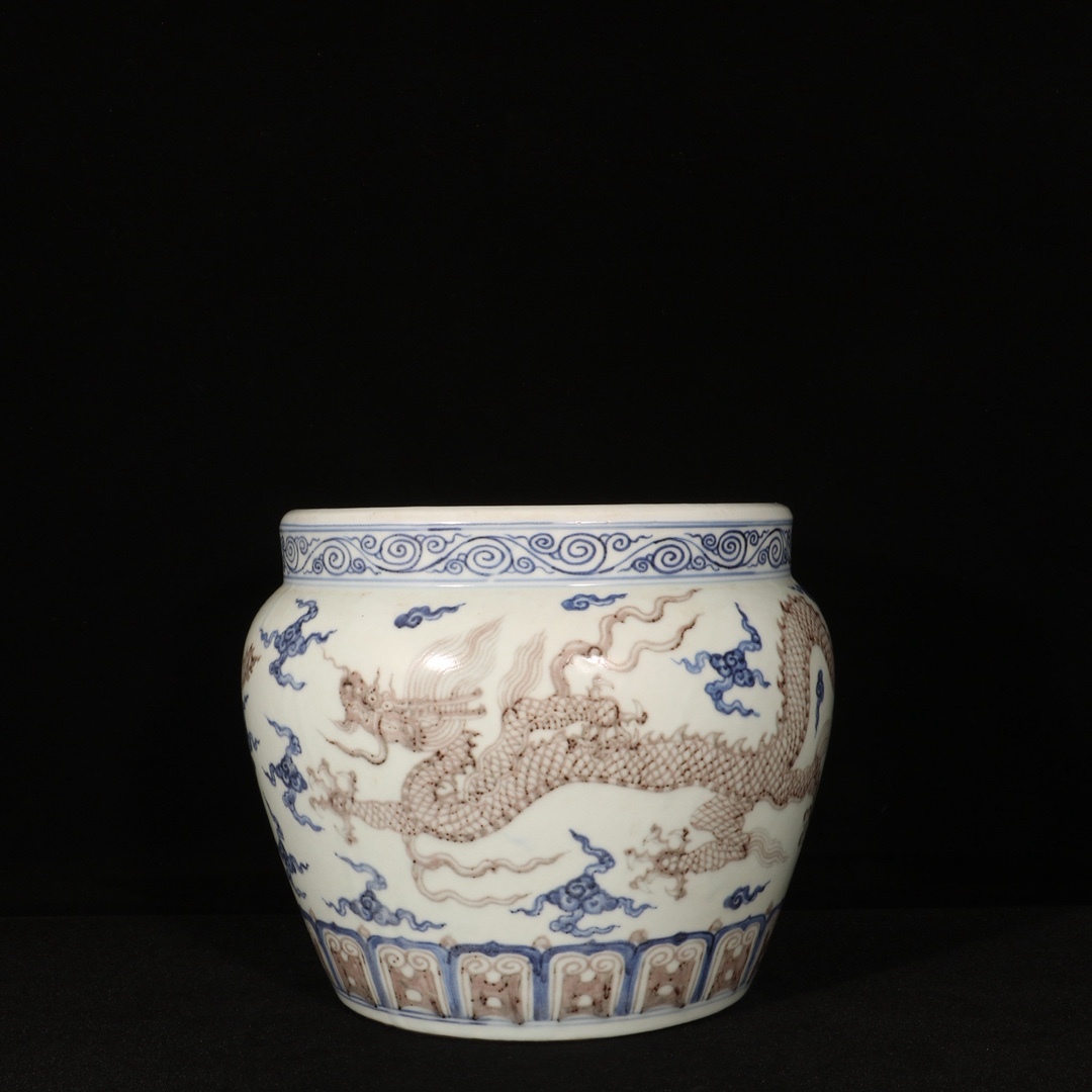 - 明時代 宣徳 青花 染付 釉里紅 雲龍文缸 唐物 箱付き 陶磁器 中国美術 古美術 置物 骨董品 高さ19cm 直径21cm RG1026