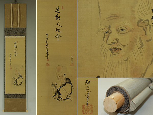 - 【模写】狩野伊川院画・宙宝宗宇賛【寿老人】◆絹本◆合箱◆改装済掛軸 r03059