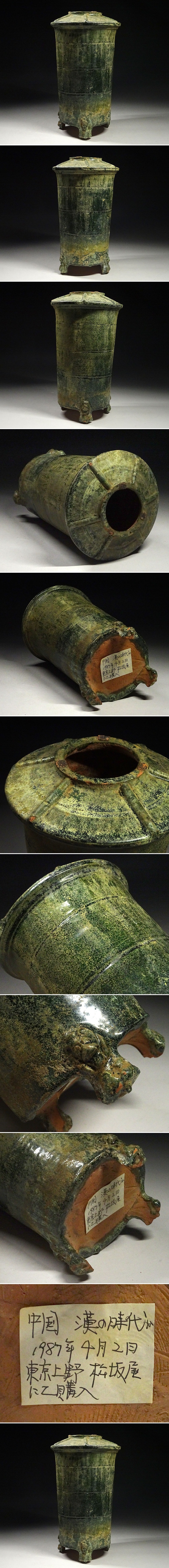 > 緑屋h■ 中国古玩 漢 緑釉 三足 穀倉壺 唐物 時代物 i9/7-7370/12-2#80