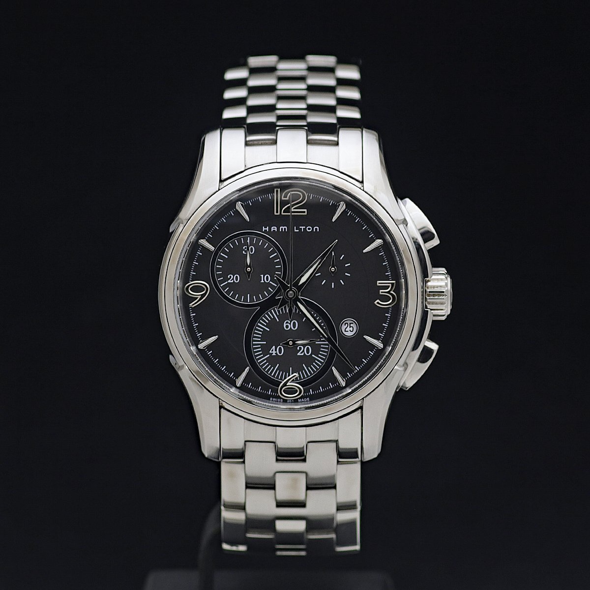 - 美品 現行 HAMILTON ハミルトン ジャズマスター クロノ H32612135/H326120 SS メンズ クォーツ 黒文字盤 箱保取 定価14.1万 SSブレス