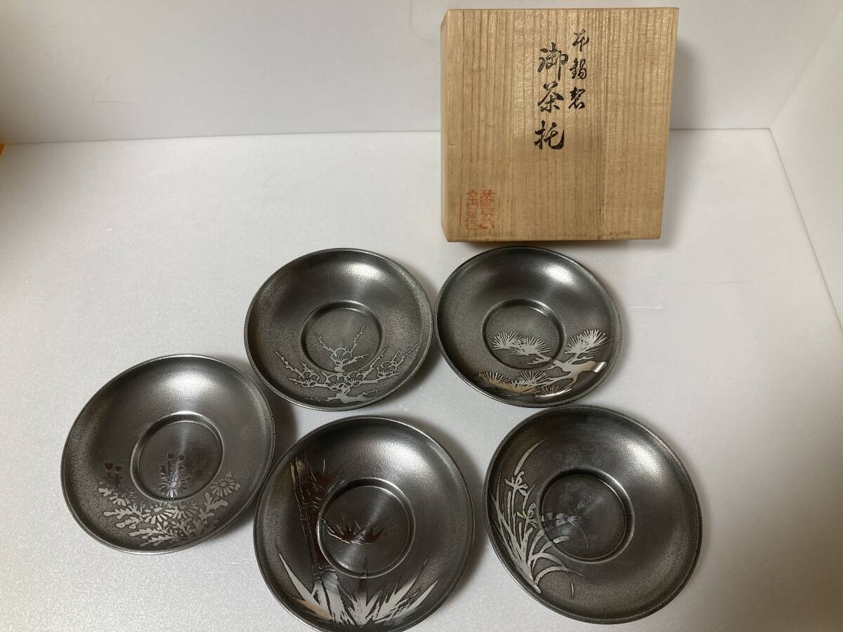 - 本錫製 茶托◆乾茂號造◆絵替わり◆松:竹:梅:菊:春蘭◆円式◆5客◆底款◆共箱◆金工◆煎茶道具◆