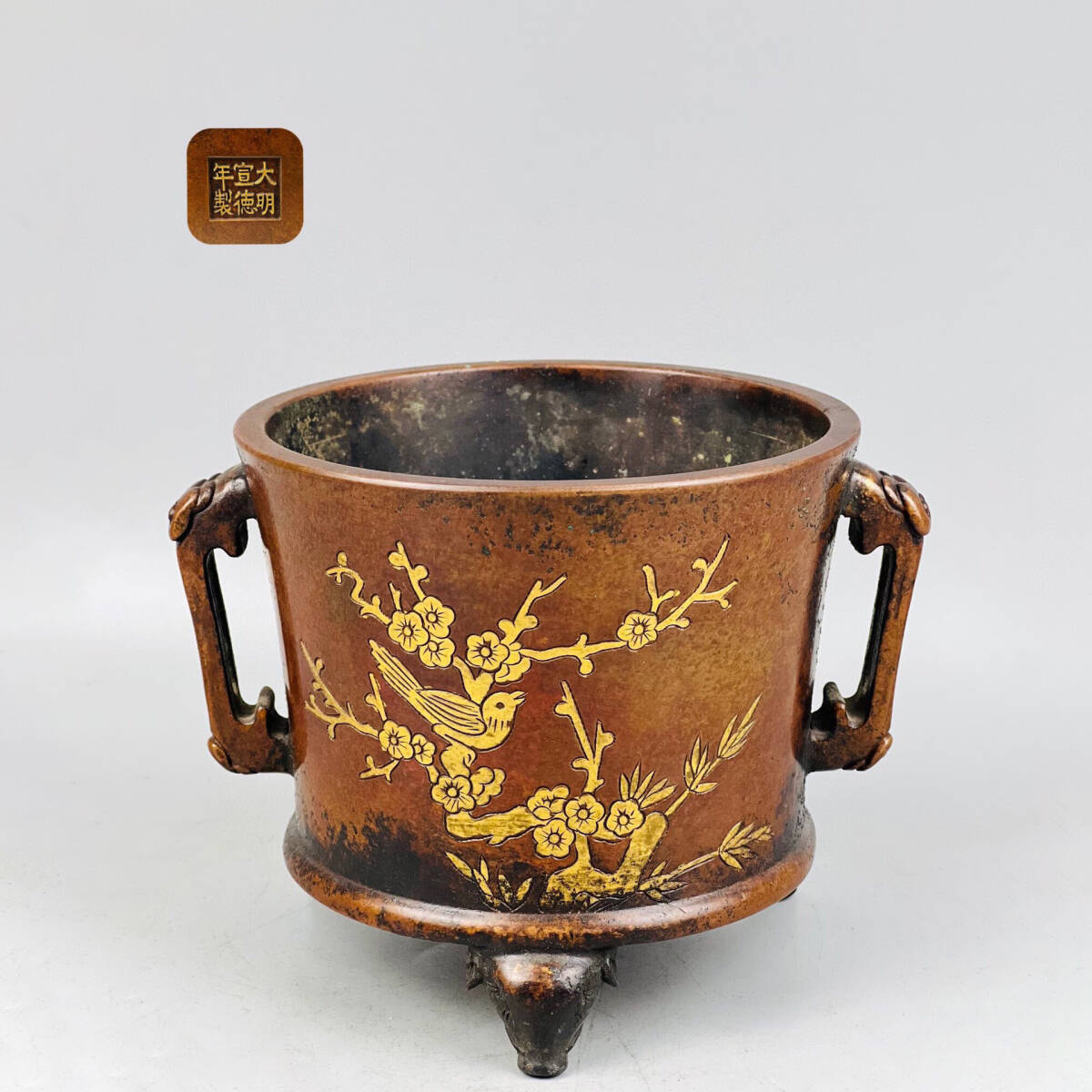 - 9+GV9744「東洋美術」 中国骨董 人間国宝 【金箔を施した三脚香炉(両持ち)】 旧物 孤品 珍品 収蔵価値が高い
