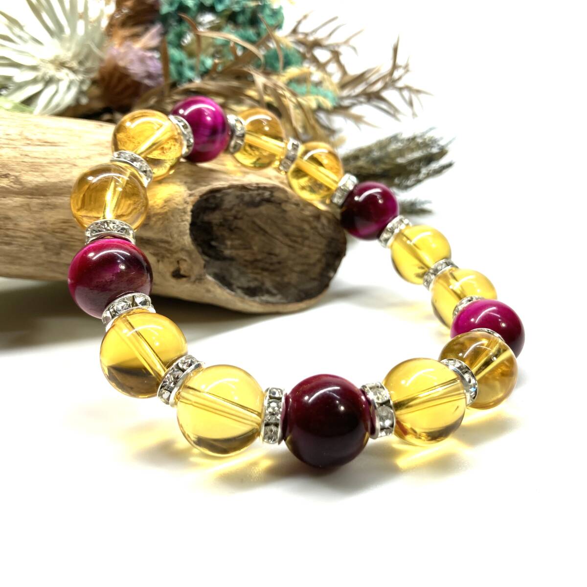 > ピンクタイガーアイ&シトリン パワーストーン ブレスレット 天然石 (シルバー) 12mm 金運 仕事運 メンズ・レディース 開運 浄化 数珠ブレス