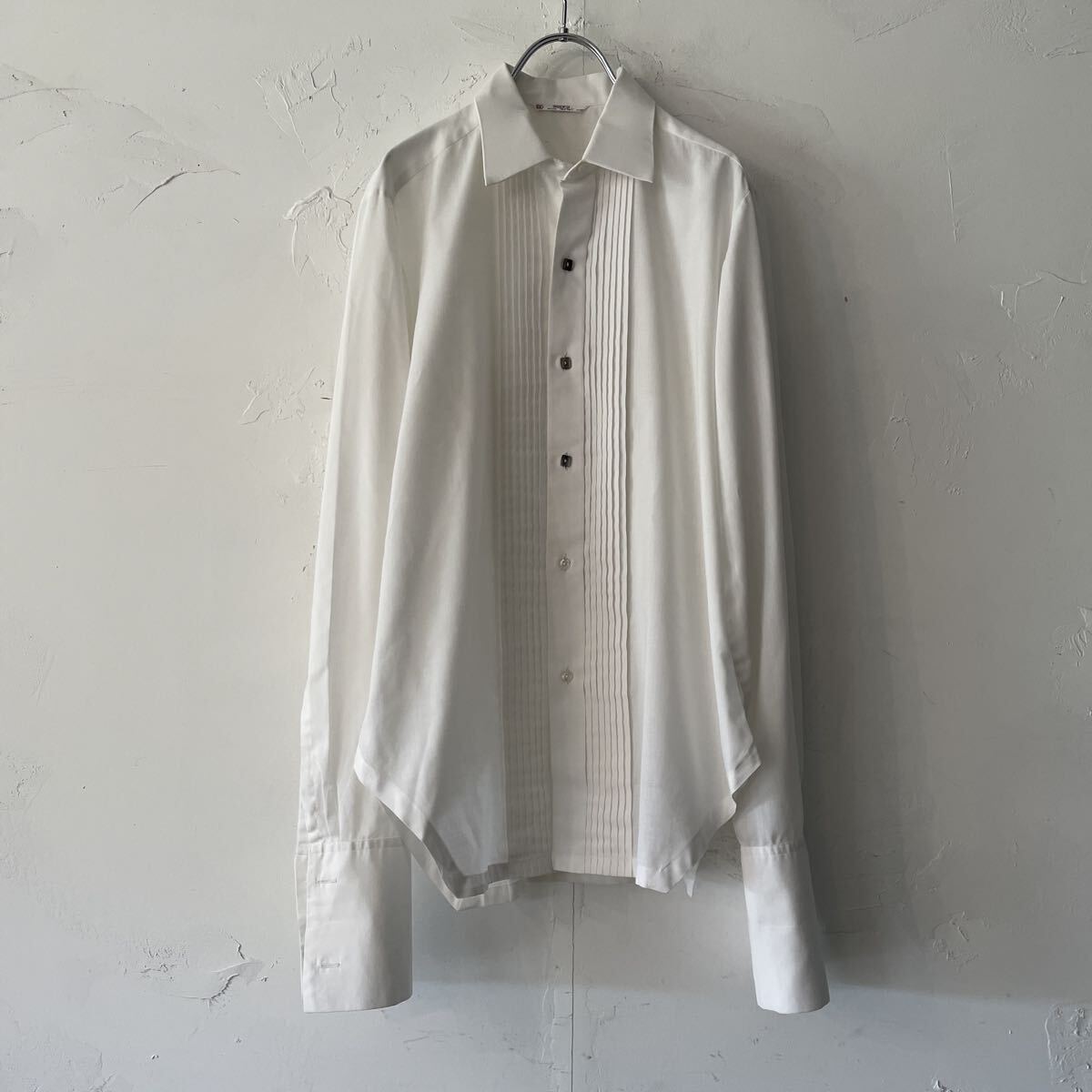 - ビンテージ 細やかなプリーツ デザイン貝ボタン ドレスシャツ 5 白 トップス メンズ レディース カフス グランパ ユーロ古着 ヨーロッパ