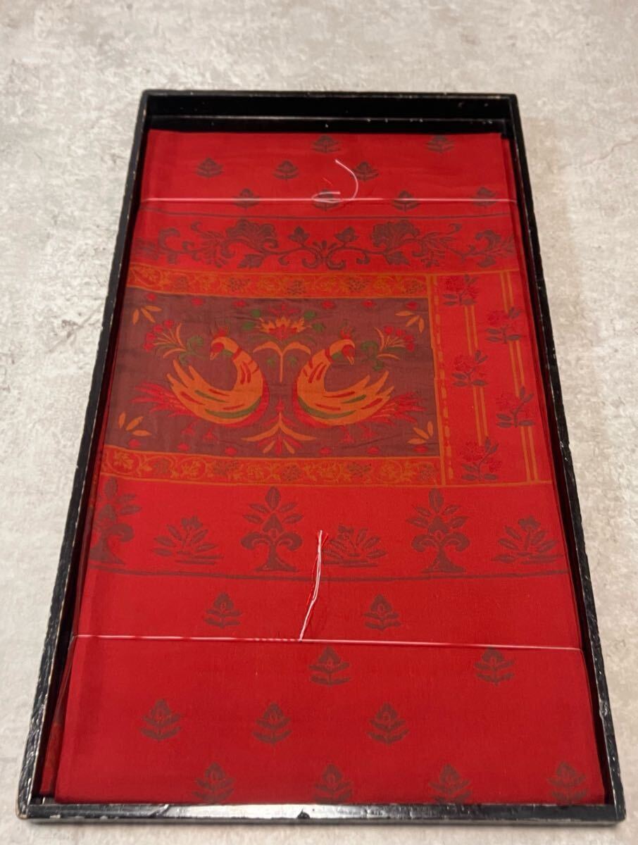 - 帯 赤系 正絹 しつけ糸付き 袋帯 鳥花 漆 呉服 織物