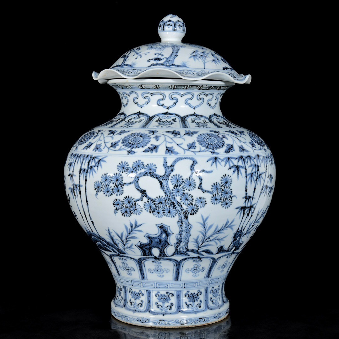 > 9+GV9767「東洋美術」 中国骨董 人間国宝 磁器製品【明代紅武の青白蓮葉文壺(松竹梅文)】 旧物 孤品 珍品 陶磁器 収蔵価値が高い