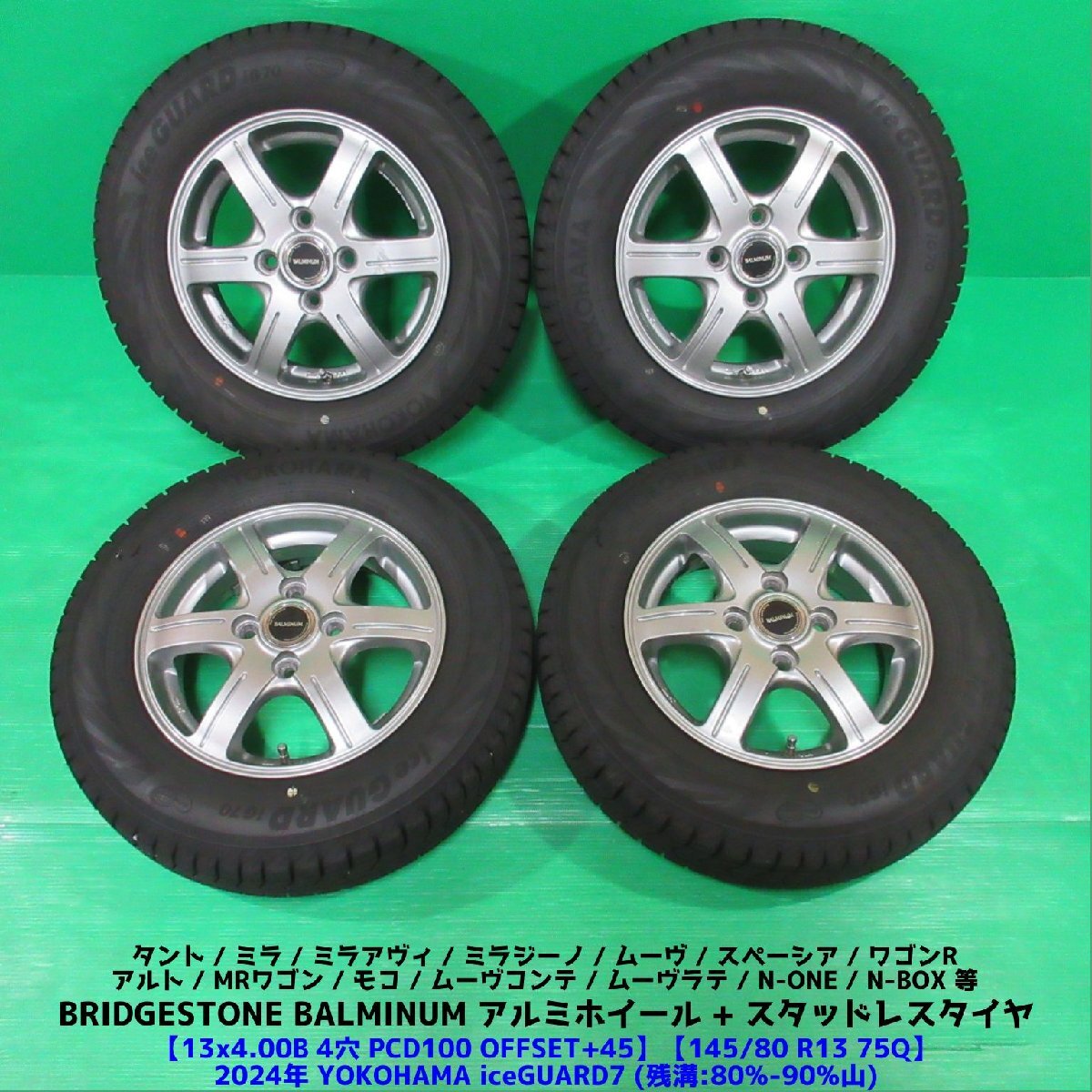 > 良品 スペーシア 145/80R13 2024年バリ山スタッドレス 80%-90%山 YOKOHAMA iceGUARD7 4本 4穴PCD100 +45 ワゴンR アルト タント 中古新潟