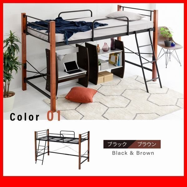 - ロフトベッド★天然木脚パイプベッド ハイタイプ シングル/高級感 安心感 床下空間利用 メッシュ床/ブラックxブラウン/a1