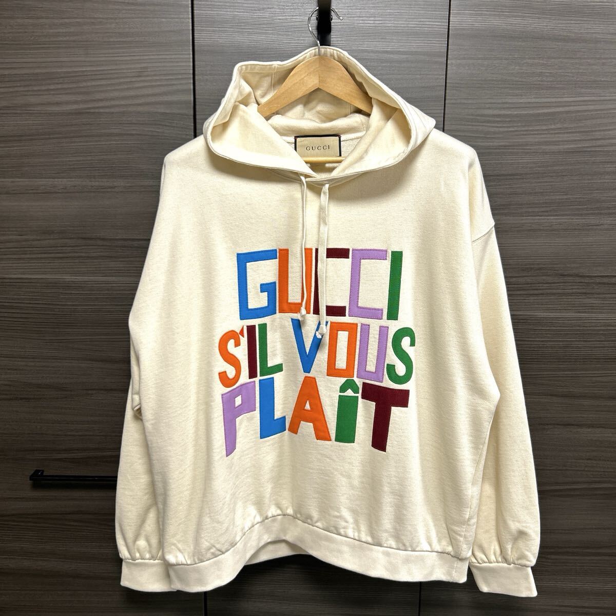 - 美品 GUCCI グッチ プルオーバーパーカー スウェット ロゴパッチ フーディー イタリア製 オーバーサイズ 大きめ マルチカラー L メンズ