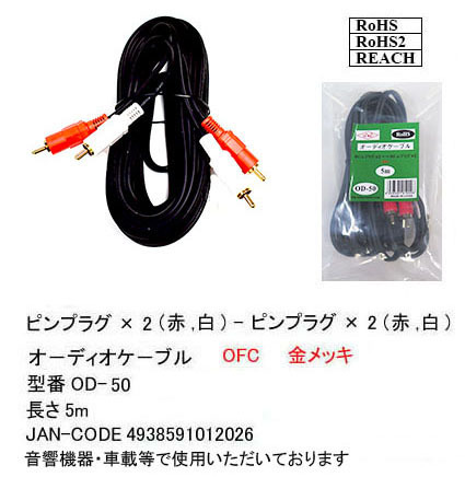 - 【OD-50】オーディオケーブル RCAピンプラグ(赤・白) 5m バルク発送(開封)