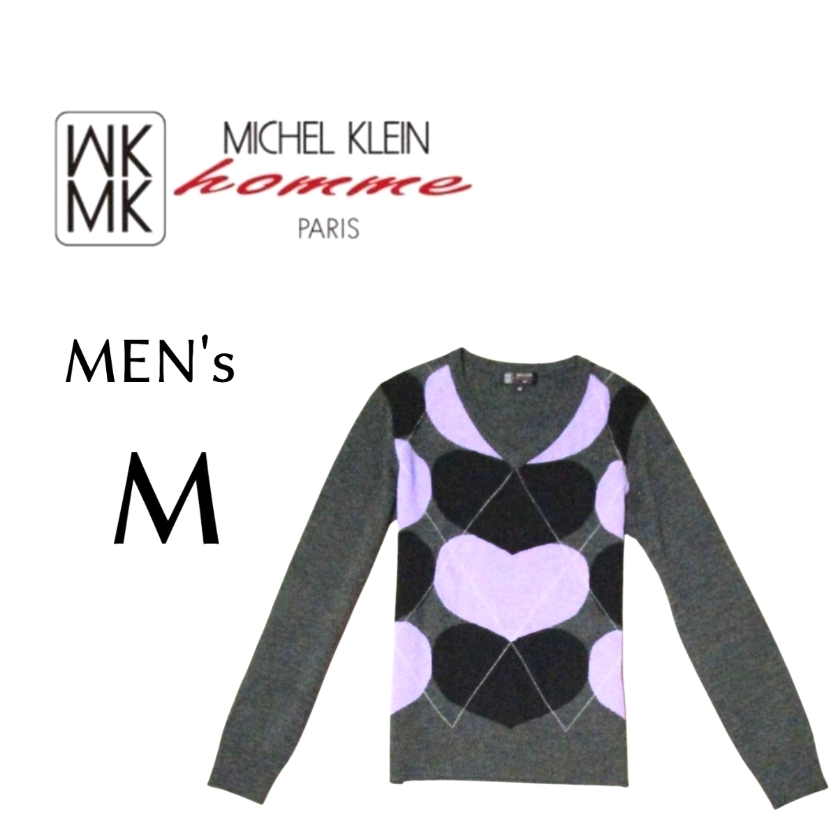 > メンズMサイズ MICHEL KLEIN ハート柄Vネック薄手ニット gray アクリル ウール