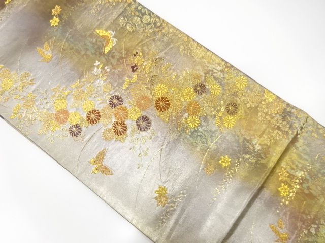 - 美品 引箔 蝶に菊・秋草模様織り出し 袋帯 (IBF4K-016)