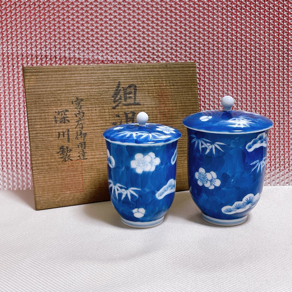 - E. 深川製磁 青 蓋付き湯飲み 2個セット 夫婦 新品未使用