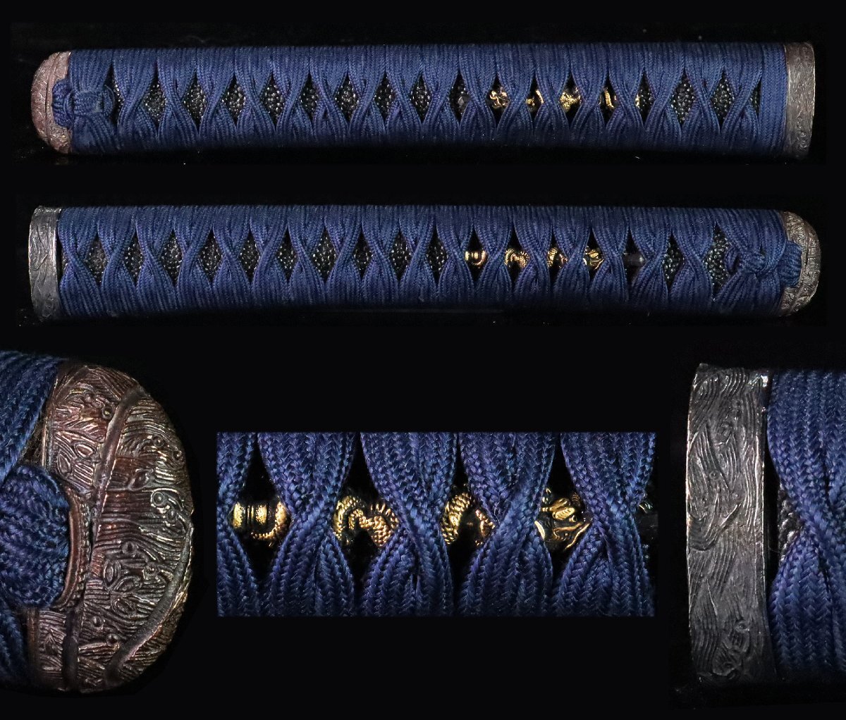 - 【ASAHI】時代武具 日本刀 柄前 鮫皮巻柄 銅地 荒波文 目貫 刀装具[79148wp]