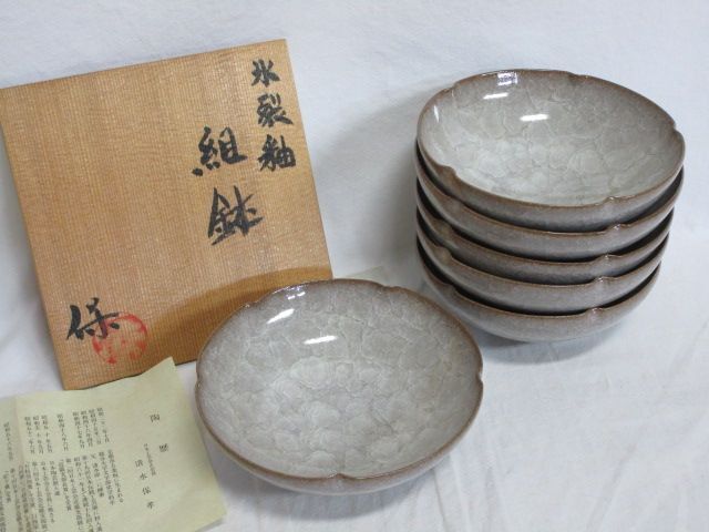 > 雉坂★【 氷裂釉 組鉢 6客 清水保孝 共箱 陶歴あり 父人間国宝清水卯一 】茶道具・懐石道具・会席道具・食器・器・深鉢・盛鉢・向付