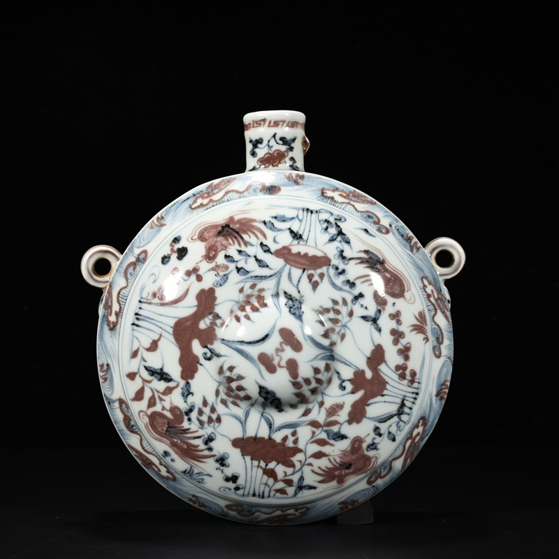 - 明時代 洪武 青花 染付 釉里紅 鴛鴦文臥壺壁壺 唐物 箱付き 陶磁器 中国美術 古美術 置物 骨董品 H39