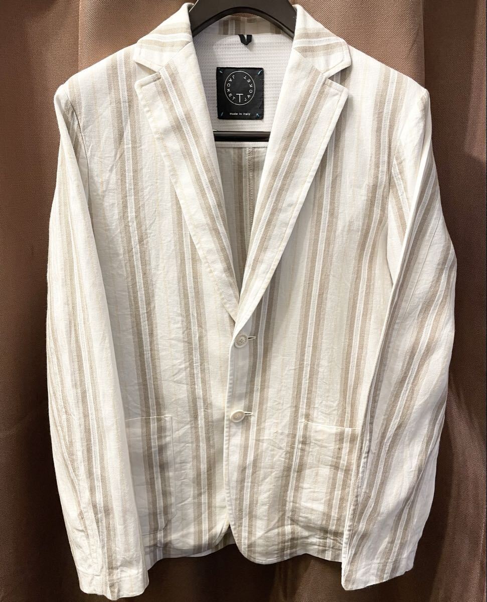 > MADE IN ITALY製 T-JACKET ストライプ柄 コットンリネン テーラードジャケット ホワイト×ブラウン Mサイズ ティージャケット イタリア製