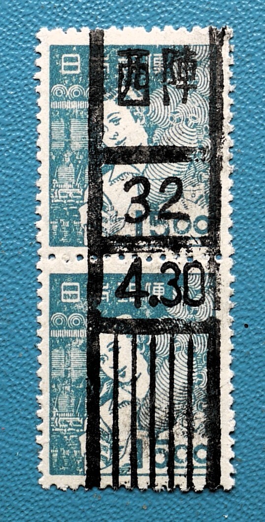 > 【戦後初期普通切手!!】(48) 産業図案 15円紡績女工ペアに満月ローラー印・西陣/32.4.30 使用済 型価5百円