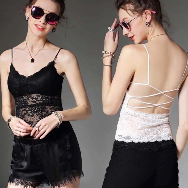 - キャミソール 背中みせ 紐 総レース パット付き ストレッチ レディース フリーサイズ ブラック