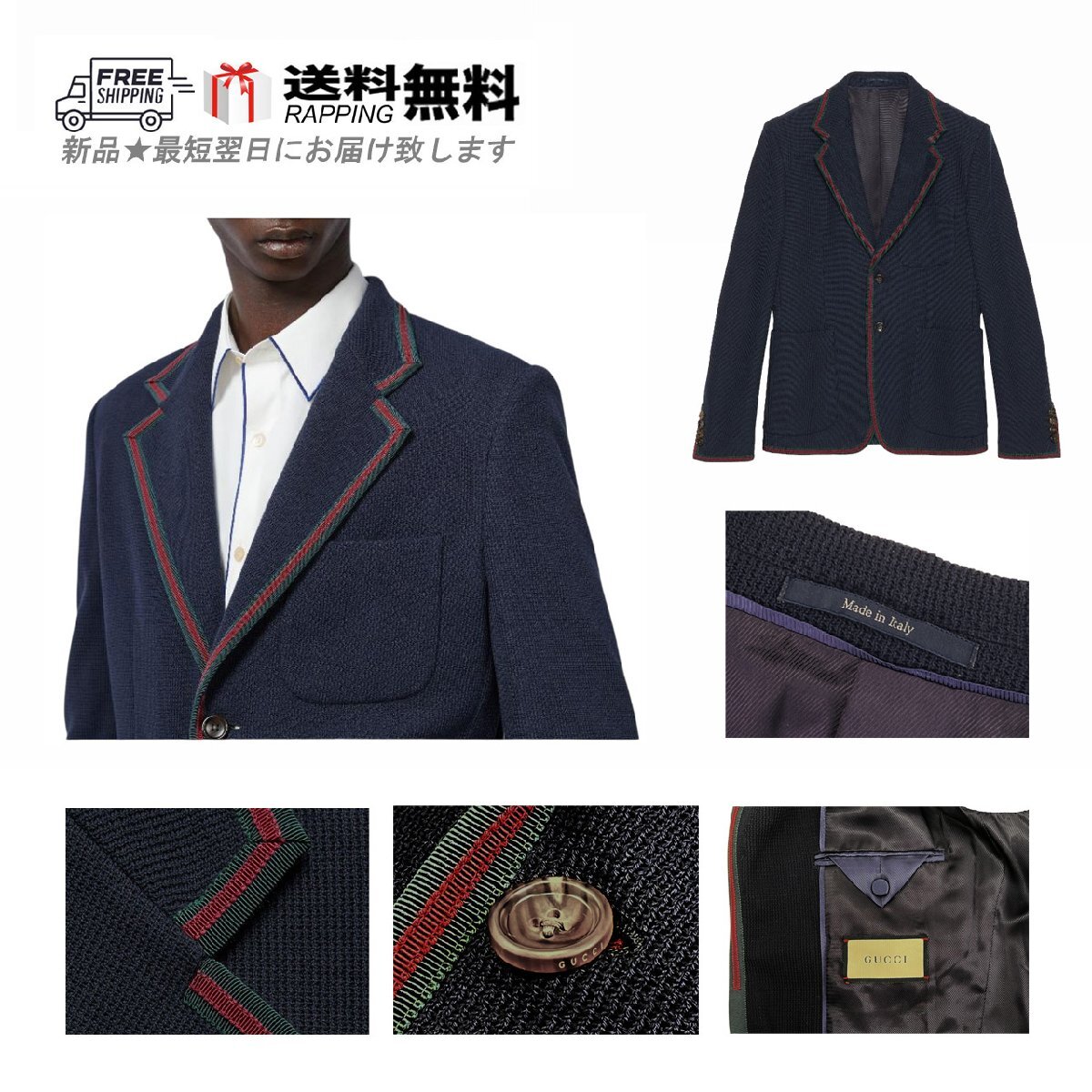 - L819-46.. GUCCI グッチ ジャケット JK コットン ブレザー リボン トリム シングル ロゴ イタリア製 ★ ネイビー