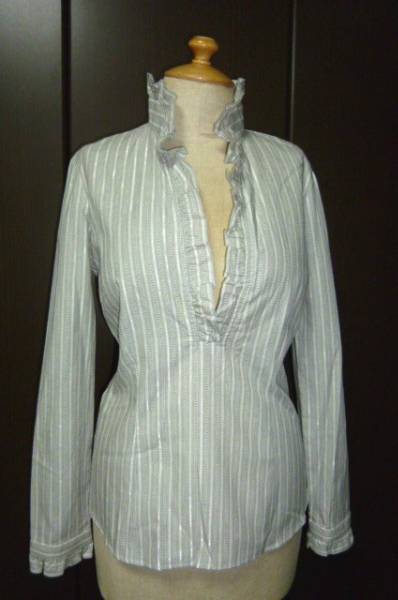 - 未使用タグ付。シルバーラメ入衿ぐりフリルシャツブラウス