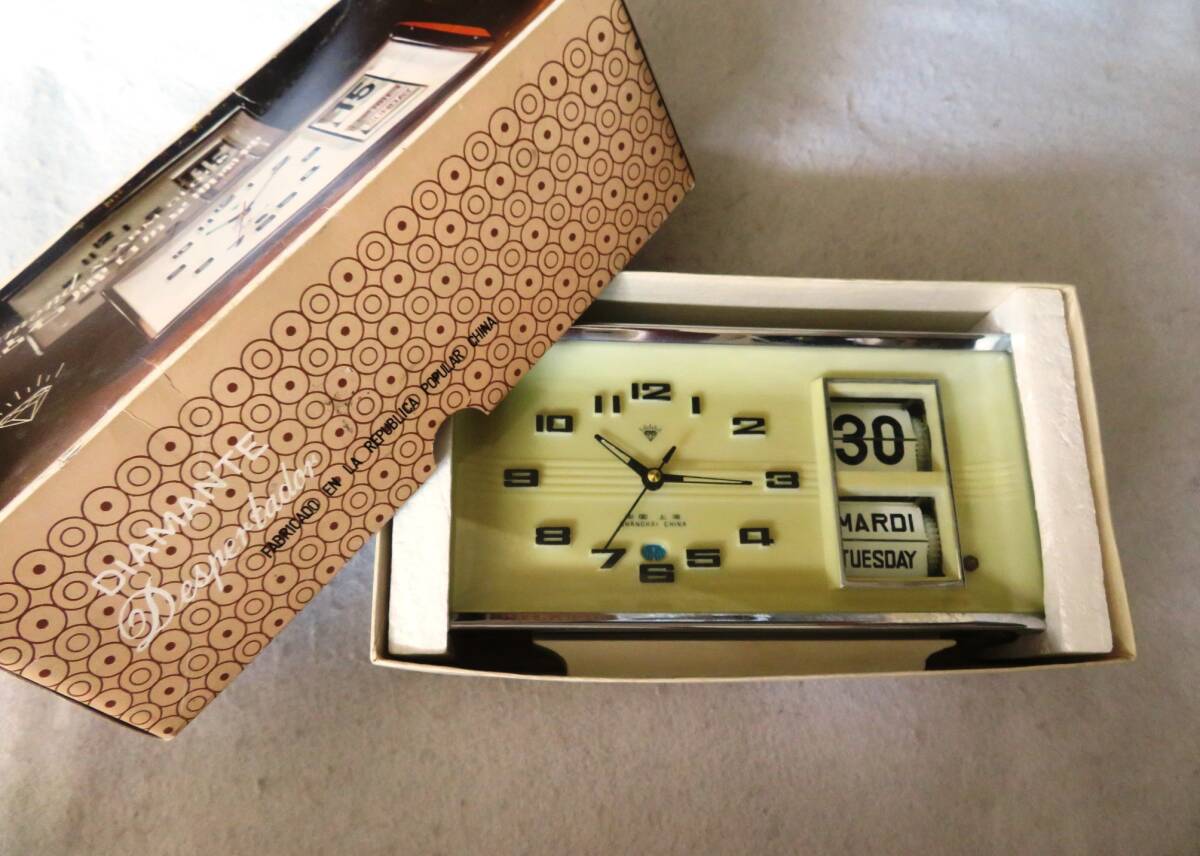 - 希少! 中国上海 鑽石牌 ダイヤモンドブランド アラームクロック アンティーク目覚し時計 パタパタ日めくり 外箱付き