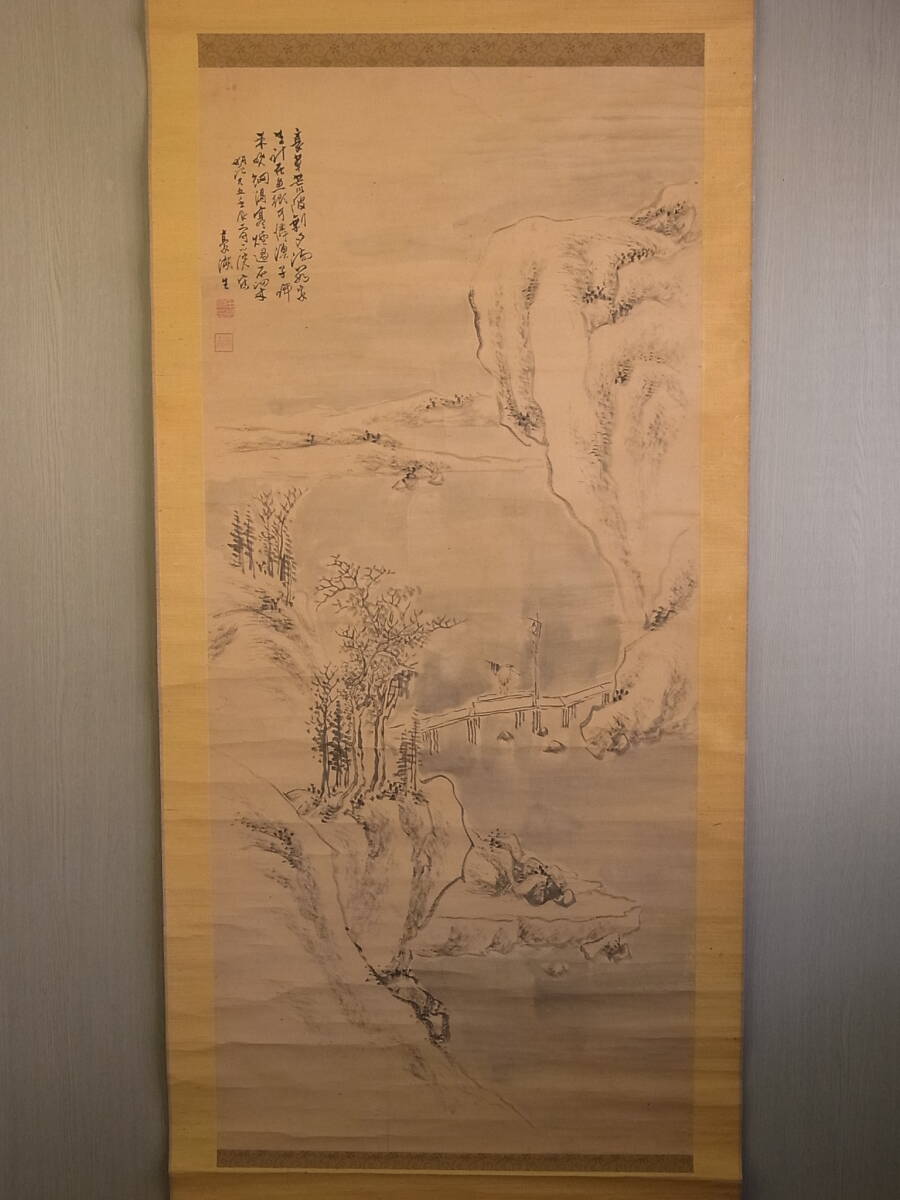 > 【真作】 t1890 蔵出 掛軸 田村豪湖 山水図 紙本 肉筆 新潟の人 日本画 風景 日本画会々員 明治期 書画骨董 古美術