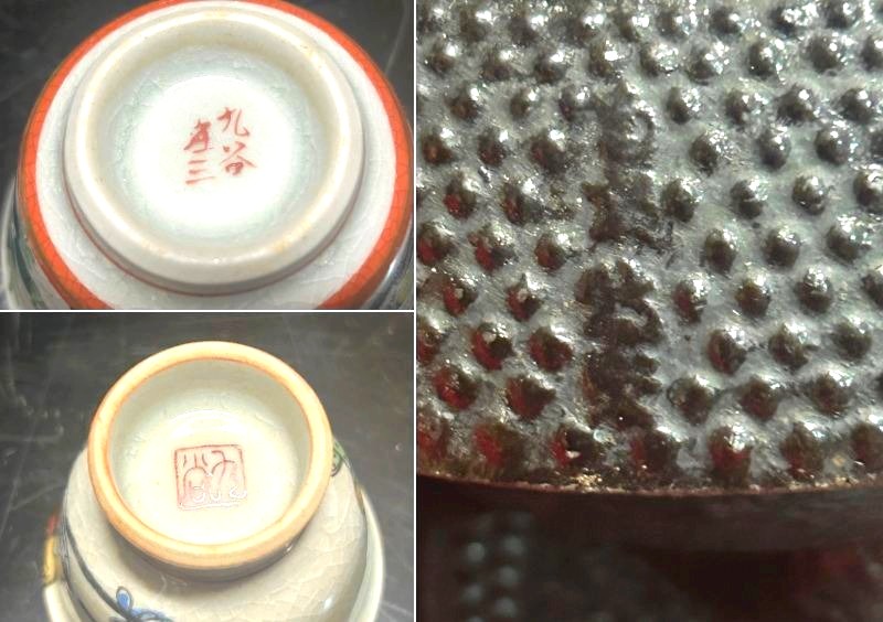> ◇煎茶器【九谷焼「「九谷庄三」「九谷」」〈茶器 銘有十客、湯さまし・宝瓶 揃い/美しい木目の刳り抜き茶櫃 鉄瓶】煎茶道具 Q09437