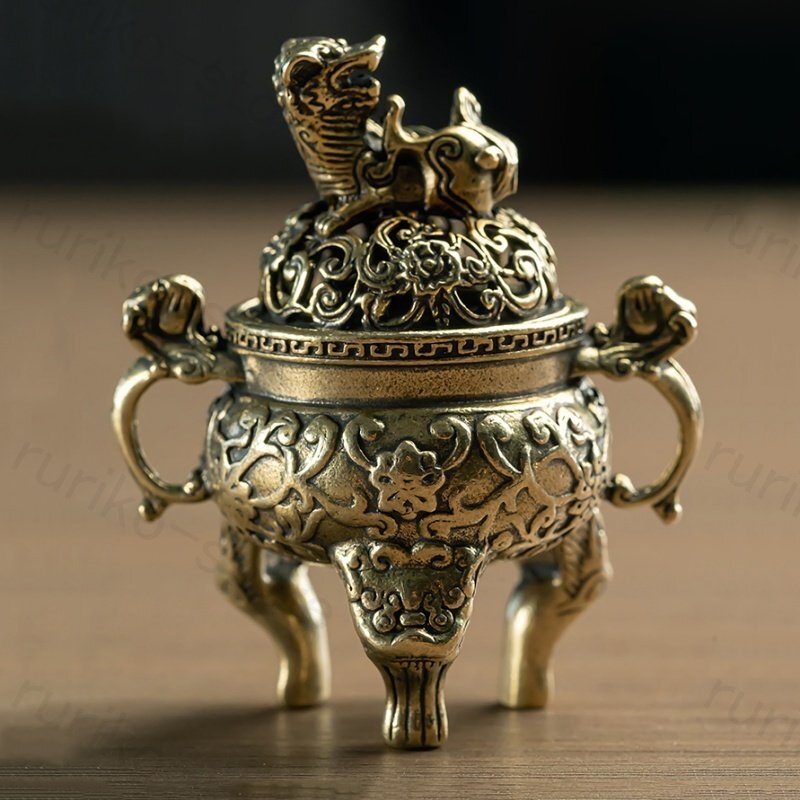 - 銅製 香炉 真鍮 重量70g さん猊 さんげい 獅子龍 香炉 香爐 三つ足 高さ約6センチ お寺 書斎 香道具 置物
