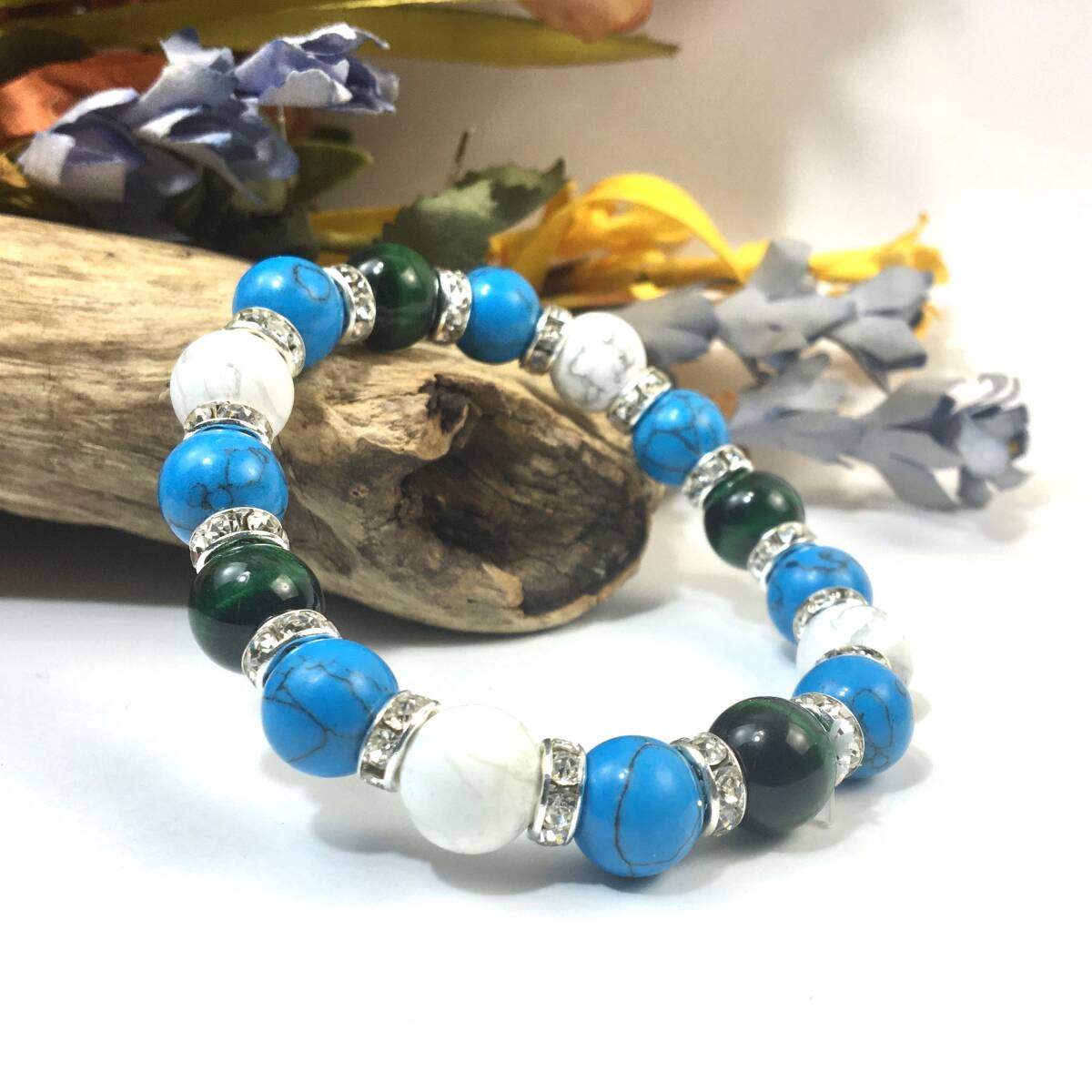 > グリーンタイガーアイ×ハウライト×ターコイズ パワーストーン ブレスレット (ロンデル: シルバー) 10mm メンズ・レディース
