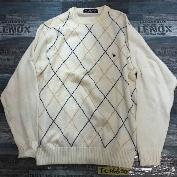 > Knights of Round Table KRT ダイヤ柄 綿100% ワンポイントロゴ刺繍 ニットセーター M オフホワイト