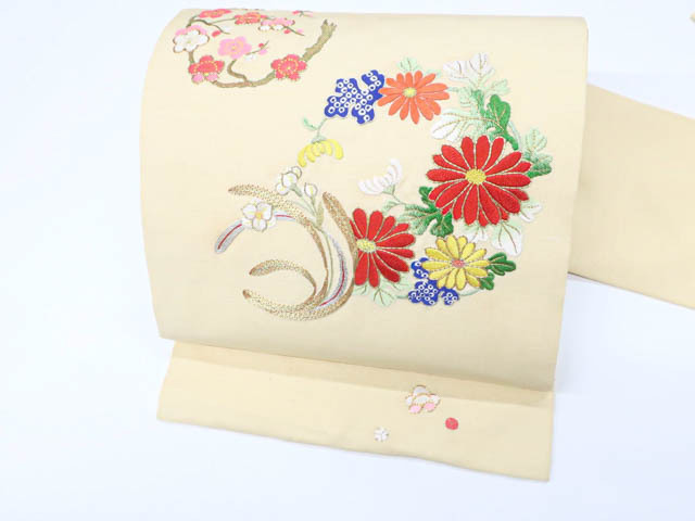 > 《京都一輝堂》リサイクル着物 九寸名古屋帯 太鼓柄 金駒刺繍 花 正絹 25b09-1751