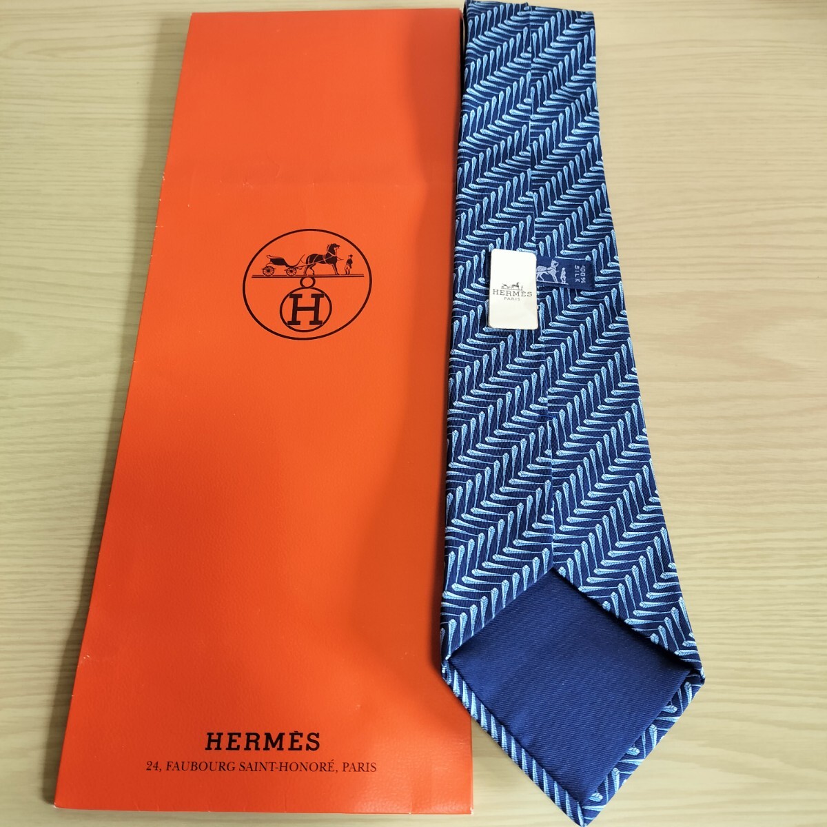 - エルメス(HERMES)紺ミニ塔ストライプ柄ネクタイ新品 未使用 タグ付き 箱付き