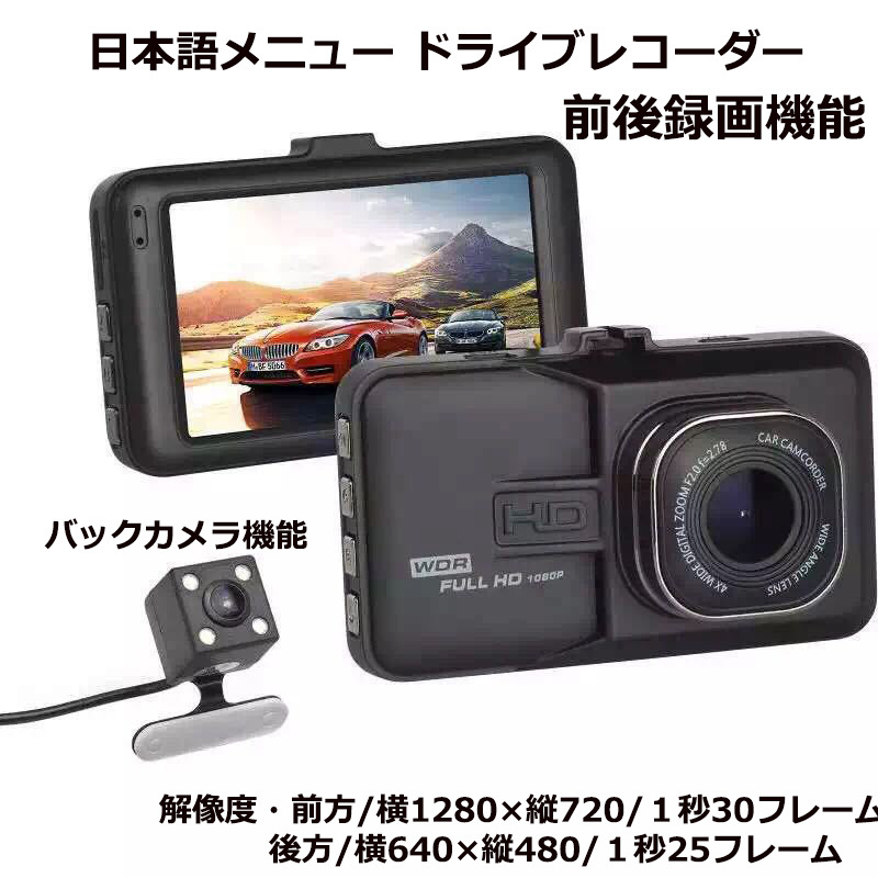 > 日本語メニュー シガー電源簡単取り付けドライブレコーダー ドラレコ 前後カメラ 2カメラ あおり運転抑止 前後同時録画 バックカメラ付き
