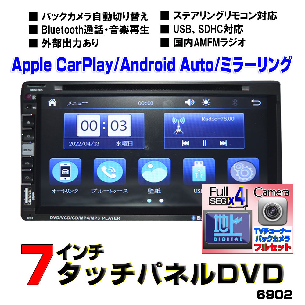 - Apple CarPlay Android Auto ミラーリングブルートゥース車載DVDプレーヤ+地デジ4x4フルセグチューナー+170度バックカメラセット