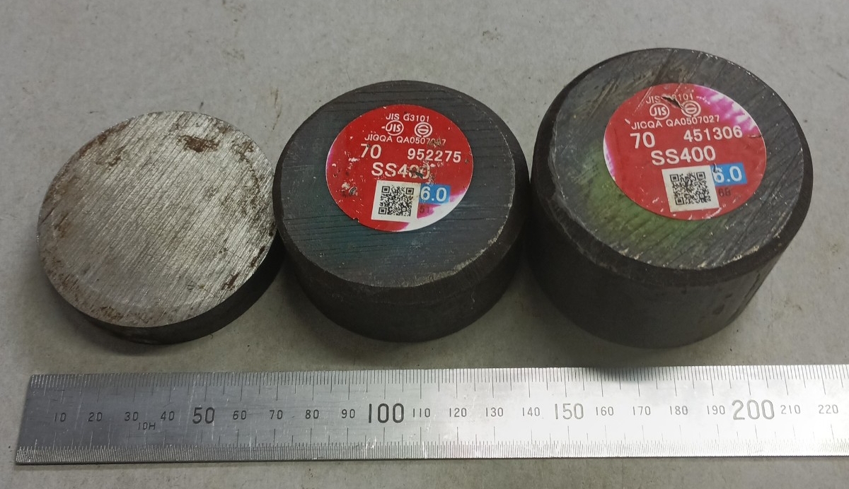 - 一般構造用圧延鋼材 SS400 丸棒 黒皮 外径70mm 長さ48mm(端材), 32mm(端材), 14mm 3個セット ノベ94mm【匿名配送】JIS G 3191 70丸