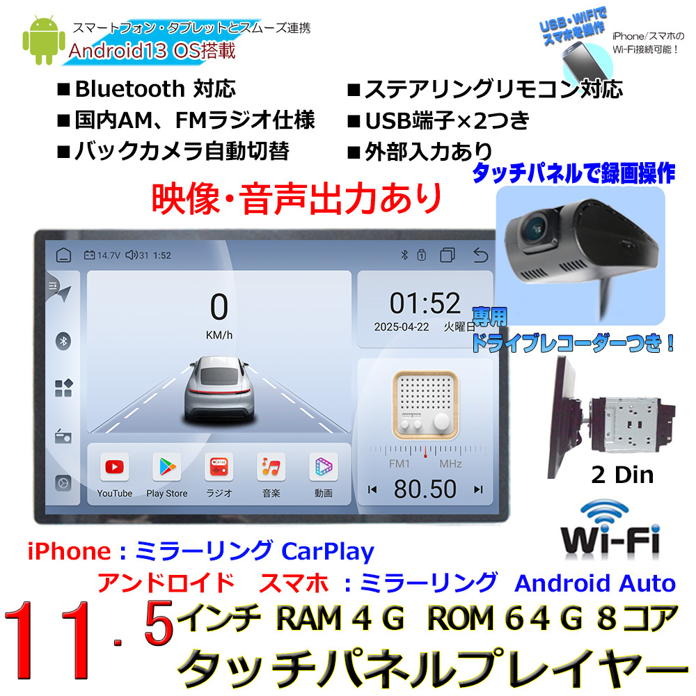 - 大画面2DIN11.5インチタッチパネルフルハイビジョンAndroid13 RAM4G ROM64G iPhone Carplay android auto+専用ドライブレコーダー