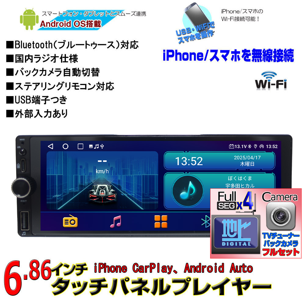 - 1DIN6.86インチタッチパネルプレイヤー+地デジ4x4フルセグチューナーセット+170度バックカメラセットAndroid搭載CarPlayAndroidauto