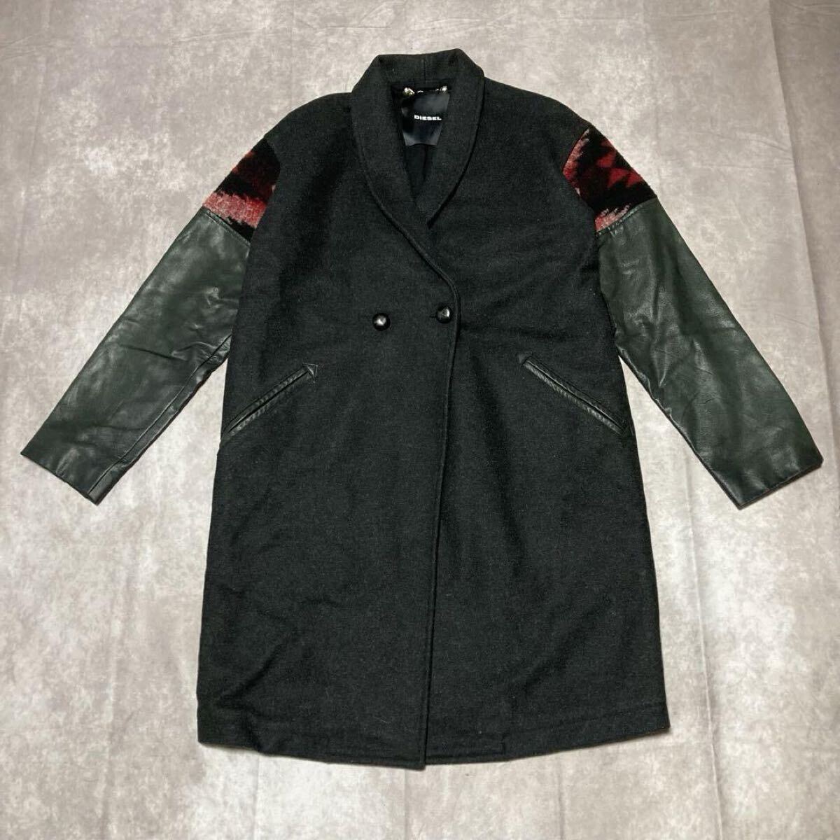 - ディーゼル DIESEL 袖ラムレザー チェスターコート ダブルブレスト アウター ロング丈 デニム 異素材ドッキング ネイティブ柄 Y2K archive