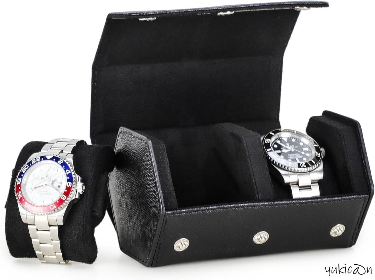 - 腕時計収納ケース 腕時計ロール ブラック 黒 2本用 六角型レトロ 本革時計ケース インテリアレザー 旅行 出張 持運び 耐衝撃 ギフト