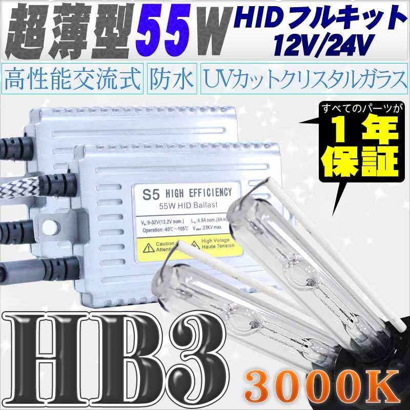 > 高性能 薄型HIDキット 55W HB3 リレー付 3000K 12V/24V 【交流式バラスト&クリスタルガラスバーナー】