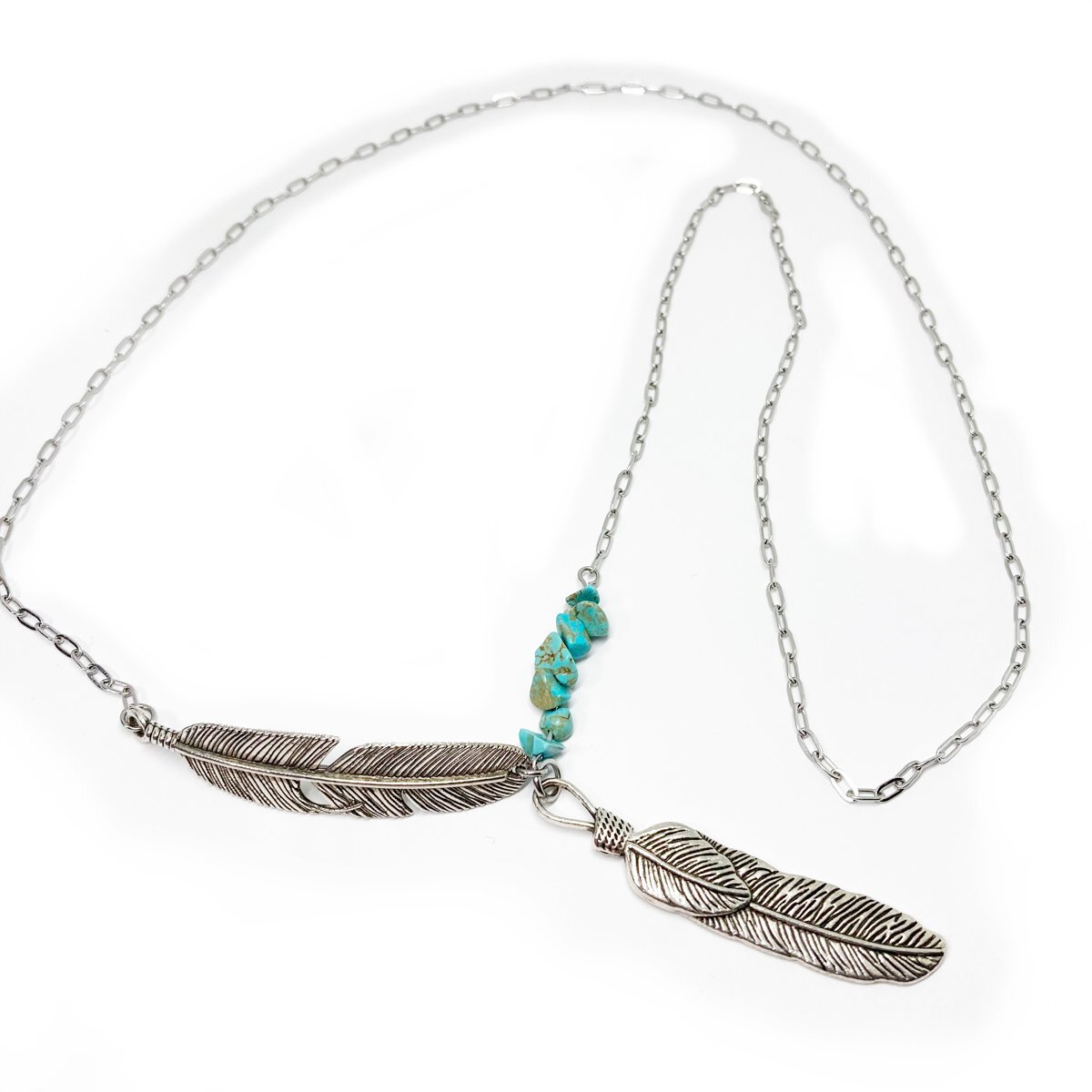 - 男女兼用 フェザーチャーム ロングネックレス 染めターコイズ 約80cm NGF02