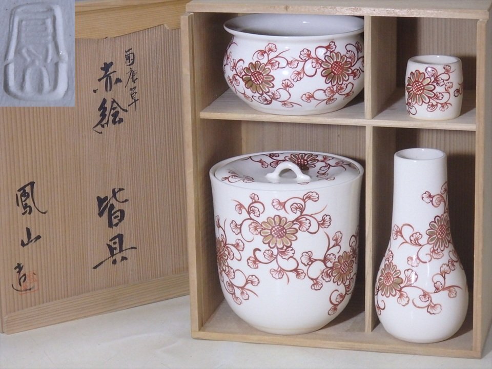 > ★美品!横田鳳山造【菊唐草赤絵皆具 共箱】水指(直径15×高さ16.5cm)・杓立・蓋置・建水の4点 茶道具 瀬戸 美濃 萬古 茶器